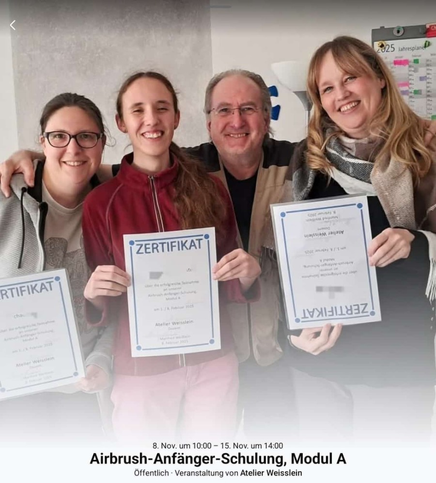 Solltet Ihr Airbrush beruflich benötigen, erkundigt Euch doch einmal bei Eurer Bundesagentur für Arbeit, unter gewissen Voraussetzungen werden die Kosten übernommen. Ihr erhaltet bei allen unseren Schulungen ein Teilnahme-Zertifikat von uns!